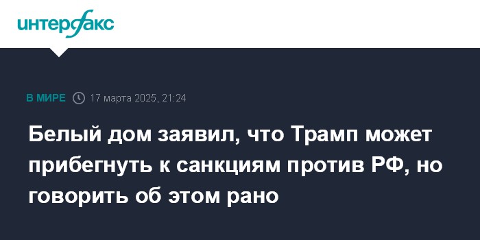 Москва. 17 марта. INTERFAX.RU - Президент США Дональд Трамп может прибегнуть к санкциям в отношении России в случае неудачи на переговорах с Москвой, но рассуждать на эту тему преждевременно, заявила в понедельник представитель Белого дома Кэролайн Левитт.