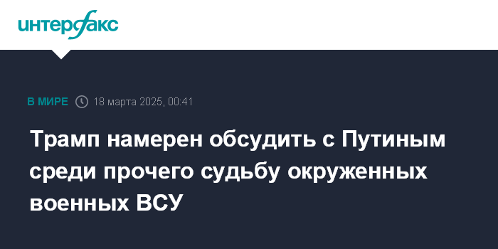 Москва. 18 марта. INTERFAX.RU - Президент США Дональд Трамп заявил, что в ходе запланированного на вторник разговора с президентом РФ Владимиром Путиным намерен, в частности, обсудить судьбу попавших в окружение украинских военных.