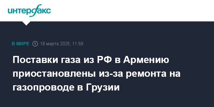 "С 09:00 часов до 18:00 18 марта на участке Казах-Сагурамо (DN 1000) транзитного магистрального газопровода "Северный Кавказ - Закавказье" на территории Грузии будут проводиться аварийно-восстановительные работы, в связи с чем будет временно приостановлена подача природного газа в Армению", - сообщила пресс-служба компании.