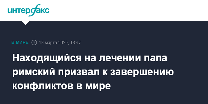 Москва. 18 марта. INTERFAX.RU - Госпитализированный в итальянской столице папа римский Франциск призывает положить конец вооруженным конфликтам в мире, сообщает во вторник Vatican News.