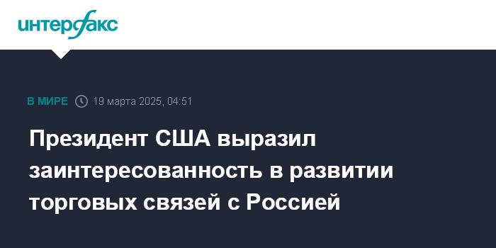 Москва. 19 марта. INTERFAX.RU - В настоящее время у США нет с Россией масштабных торговых отношений, но обе стороны в них заинтересованы, заявил в интервью Fox News президент США Дональд Трамп.