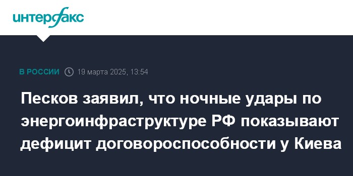 Москва. 19 марта. INTERFAX.RU - Украинские удары по российской энергетической инфраструктуре в ночь на среду являются наилучшим свидетельством недоговороспособности Киева, заявил пресс-секретарь президента РФ Дмитрий Песков.