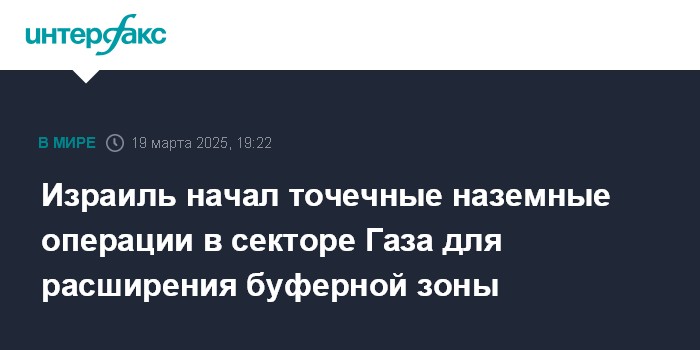 Москва. 19 марта. INTERFAX.RU - В Армии обороны Израиля (ЦАХАЛ) подтвердили начало точечных наземных операций в центральной и южной частях сектора Газа, направленных на расширение буферной зоны, сообщает в среду официальный телеграм-канал ЦАХАЛ.