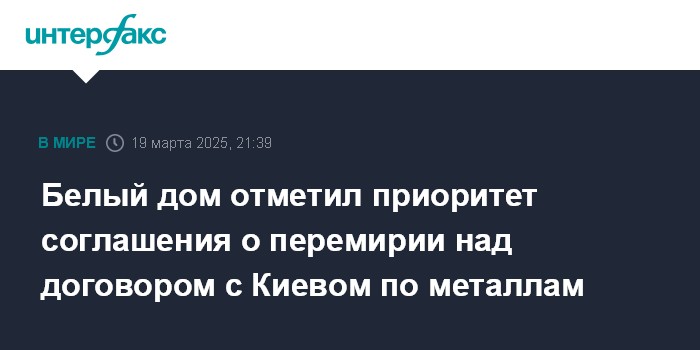 Москва. 19 марта. INTERFAX.RU - Для властей США в данный момент приоритетом является прекращение огня на Украине, а не заключение соглашения с Киевом по редкоземельным металлам. Об этом заявила на брифинге в среду представитель Белого дома Кэролайн Левитт.