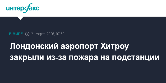 Москва. 21 марта. INTERFAX.RU - Аэропорт Хитроу в Лондоне ждут значительные перебои в работе в ближайшие дни из-за возникшего неподалеку пожара на подстанции, сообщает телеканал Sky News со ссылкой на представителя аэропорта.