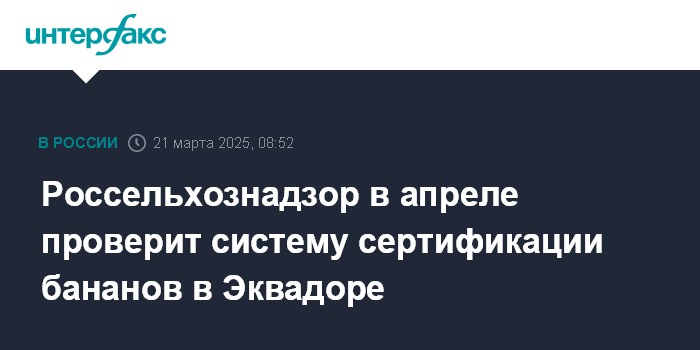 Москва. 21 марта. INTERFAX.RU - Сотрудники Россельхознадзора в апреле проведут аудит системы сертификации бананов в Эквадоре, сообщила российская служба после переговоров ее представителей с сотрудниками Агентства по контролю над качеством сельхозпродукции (AGROCALIDAD) Министерства сельского хозяйства, животноводства Эквадора.