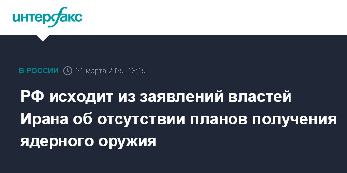 Москва. 21 марта. INTERFAX.RU - В Кремле исходят из неоднократно сделанных заявлений руководства Ирана об отсутствии у исламской республики планов получения ядерного оружия в ходе реализации ядерной программы, сообщил пресс-секретарь президента РФ Дмитрий Песков.