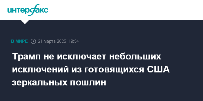 Москва. 21 марта. INTERFAX.RU - Президент США Дональд Трамп в пятницу заявил, что в зеркальных пошлинах на иностранные товары, которые готовит американская администрация, будет ряд исключений.