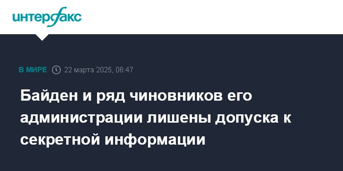 Москва. 22 марта. INTERFAX.RU - Президент США Дональд Трамп принял решение о лишении доступа к секретной информации бывшего президента страны Джо Байдена и всех членов его семьи, а также ряда высокопоставленных сотрудников предыдущей американской администрации, сообщил Белый дом.