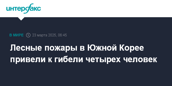 Москва. 23 марта. INTERFAX.RU - По предварительным данным, на утро воскресенья четыре человека погибли, шестеро пострадали в результате лесных пожаров, охвативших юго-восточный район Южной Кореи, сообщило агентство "Ренхап" со ссылками на власти.