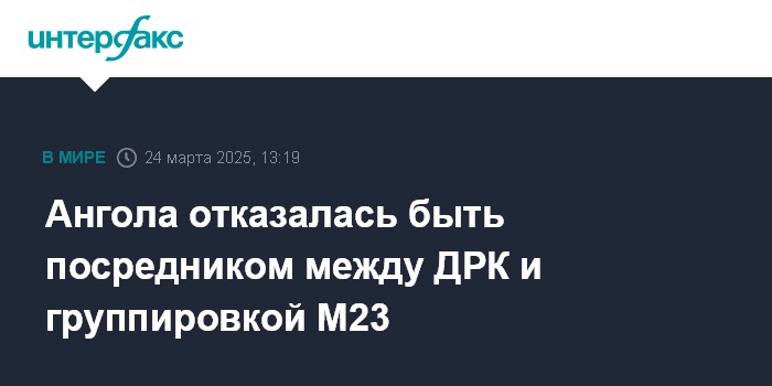Москва. 24 марта. INTERFAX.RU - Власти Анголы, которая сейчас председательствует в Африканском союзе, решили более не играть роль посредника в урегулировании конфликта на востоке Демократической Республики Конго между правительством страны и группировкой "Движение 23 марта" (М23), сообщают западные СМИ.