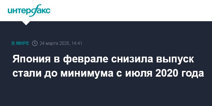 Москва. 24 марта. INTERFAX.RU - Япония сократила выплавку стали в феврале на 8,5% в годовом исчислении - до 6,4 млн тонн, по данным Японской федерации чугуна и стали.