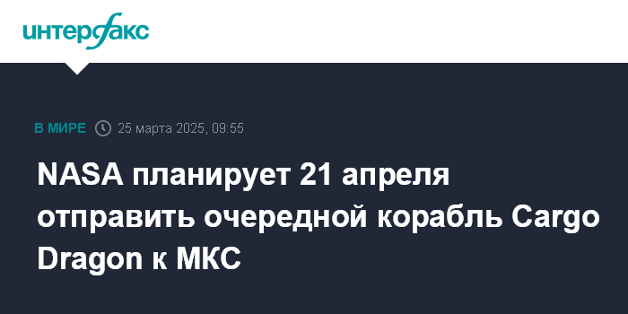 Москва. 25 марта. INTERFAX.RU - Очередной многоразовый грузовой космический корабль Cargo Dragon компании SpaceX 21 апреля отправится к Международной космической станции (МКС), сообщает NASA.