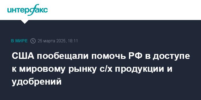 Москва. 25 марта. INTERFAX.RU - Вашингтон поможет Москве восстановить доступ к мировому рынку сельскохозяйственной продукции и удобрений, снизить стоимость морской страховки. Об этом говорится в заявлении Белого дома по итогам переговоров в Саудовской Аравии.