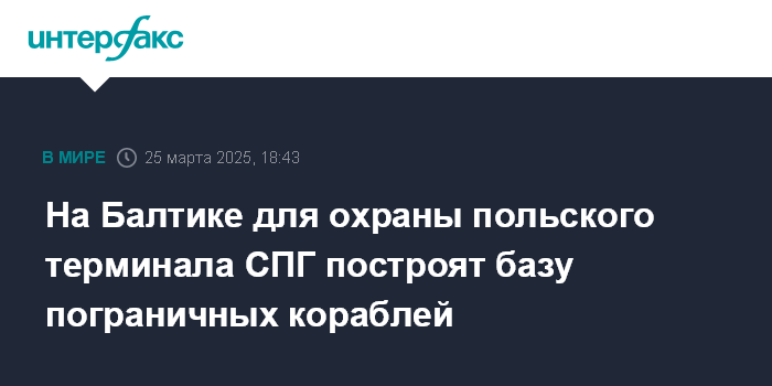 Москва. 25 марта. INTERFAX.RU - На Балтийском море рядом с польским терминалом СПГ в порту Свиноуйсьце будет построена база пограничных кораблей, это повысит безопасность терминала, сообщила пресс-служба пограничной стражи Польши.