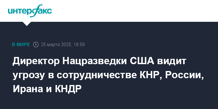 Москва. 25 марта. INTERFAX.RU - Взаимодействие Китая, России, Ирана и Северной Кореи в ряде сфер создает угрозы для интересов США, заявила директор Национальной разведки США Тулси Габбард в профильном комитете Сената.