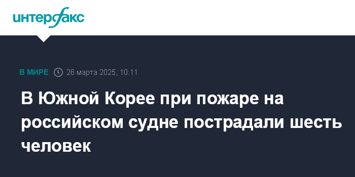 "26 марта в 07:14 (по местному времени) в море в 8 км от порта Камчхон (Пусан) произошел пожар на российском рефрижераторном судне Crystal Asia (экипаж - 23 человека, из них 22 - граждане России). По информации морской полиции Пусана, шесть россиян пострадали, двое из них - в тяжелом состоянии", - говорится в сообщении.