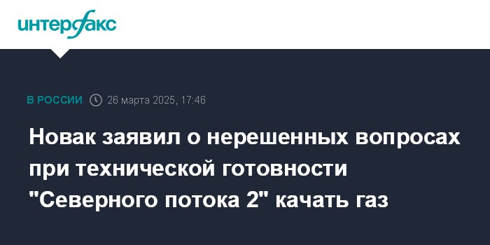 "Здесь вопрос не технический - технически, в принципе, газопровод в рабочем состоянии. А вопрос в целом - по возможности поставок, возможности эксплуатации. Здесь очень много вопросов на сегодняшний день. Как мы знаем, что нет потребителя, нет договора. А с точки зрения техники, в принципе, это газопровод в рабочем состоянии", - сказал российский чиновник.