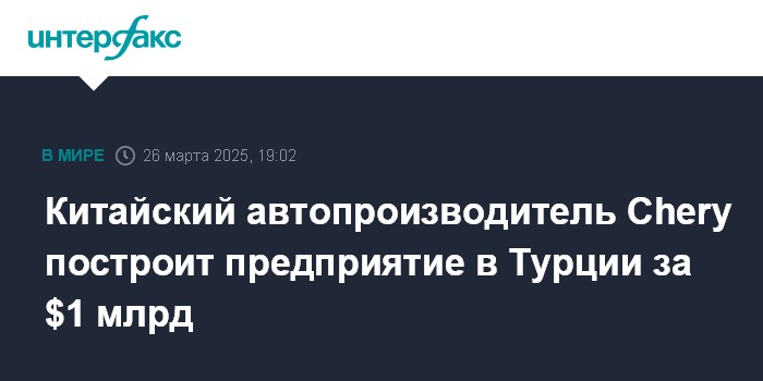 Москва. 26 марта. INTERFAX.RU - Китайский автопроизводитель Chery Automobile Co. планирует построить предприятие по выпуску электромобилей в Турции стоимостью $1 млрд.