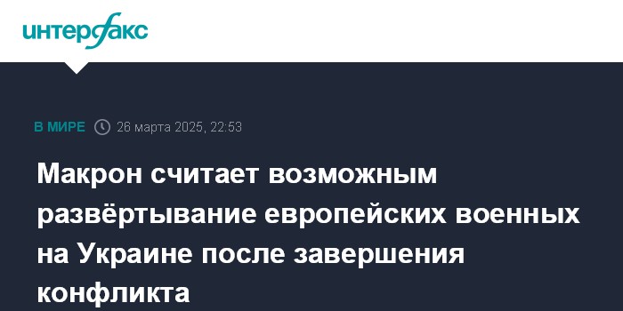 Москва. 26 марта. INTERFAX.RU - Европейские военные могли бы разместиться на территории Украины, но не на передовых позициях, предположил в среду президент Франции Эмманюэль Макрон.