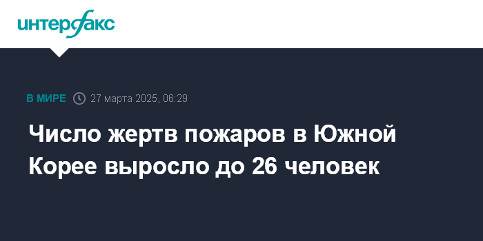 Москва. 27 марта. INTERFAX.RU - Число погибших в результате лесных пожаров в Южной Корее достигло 26 человек, сообщает "Ренхап" со ссылкой на правительство.