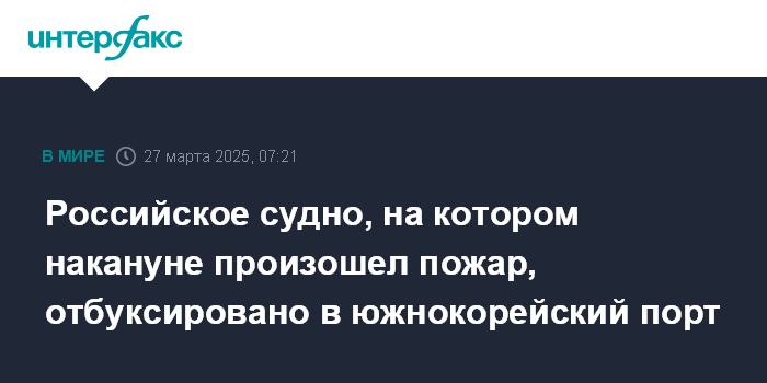 Москва. 27 марта. INTERFAX.RU - Российское рефрижераторное судно, на котором в среду в результате пожара пострадали шесть моряков, отбуксировано в южнокорейский порт Камчхон, сообщило генеральное консульство России в Пусане в своем телеграм-канале в четверг.