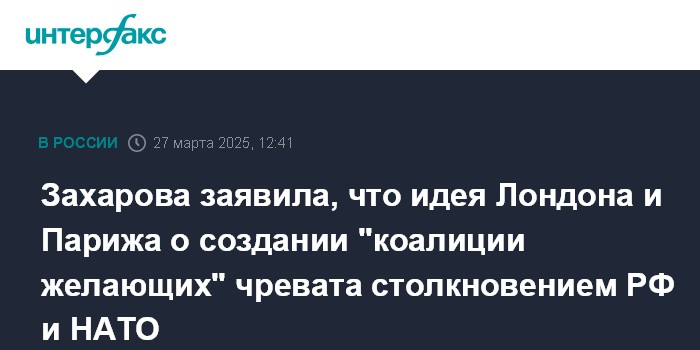 "Россия категорически против такого сценария, который чреват прямым столкновением России и НАТО", - сказала она на брифинге в четверг, комментируя инициативу Лондона и Парижа о создании "коалиции желающих" для гарантий мира на Украине.