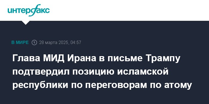Москва. 28 марта. INTERFAX.RU - Министр иностранных дел Ирана Аббас Аракчи направил президенту США Дональду Трампу ответ на письмо о переговорах по иранской ядерной программе, в котором подтвердил позицию Тегерана, сообщило иранское информагентство ИРНА.