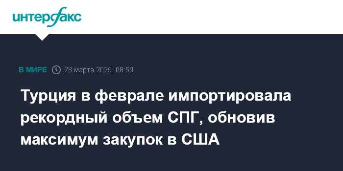Москва. 28 марта. INTERFAX.RU - Турция в феврале 2025 года импортировала 3,063 млрд куб. м сжиженного природного газа (2,355 млн тонн в сжиженном виде), что почти в два раза больше, чем годом ранее - 1,662 млрд куб. м, сообщает Евростат. Это рекордный показатель для месячного импорта СПГ в Турцию.