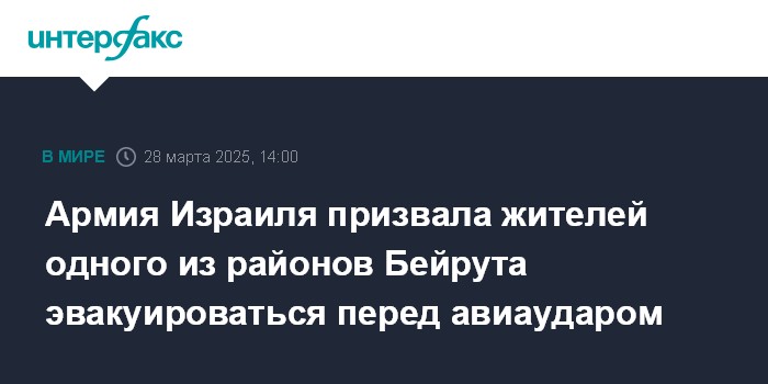 Москва. 28 марта. INTERFAX.RU - Армия обороны Израиля (ЦАХАЛ) в пятницу обнародовала предупреждение о готовящемся авиаударе по объекту движения "Хезболла" в южном Бейруте и обратилась с призывом к местным жителям покинуть этот район, сообщает The Times of Israel.