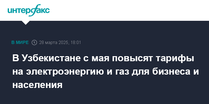 Москва. 28 марта. INTERFAX.RU - В Узбекистане с 1 мая вступят в силу новые тарифы на газ и электроэнергию, сообщило Минэнерго страны.