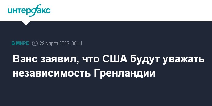 Вице-президент отметил, что Вашингтон "будет уважать суверенитет" независимой Гренландии, не будет применять военную силу для захвата Гренландии, но может использовать свои вооруженные силы для защиты от вторжений со стороны России или Китая.