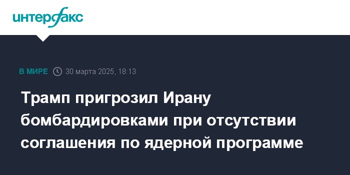 Москва. 30 марта. INTERFAX.RU - Американский президент Дональд Трамп заявил, что если Вашингтон и Тегеран не достигнут соглашения по иранской ядерной программе, то США осуществят мощную бомбардировку Ирана.