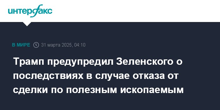 Москва. 31 марта. INTERFAX.RU - Президент США Дональд Трамп предупредил, что если Киев откажется от соглашения о добыче полезных ископаемых, то он столкнется с серьезными проблемами.