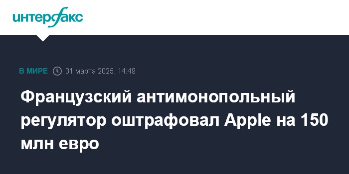 Москва. 31 марта. INTERFAX.RU - Французский антимонопольный регулятор Autorite de la concurrence оштрафовал американскую Apple Inc. на 150 млн евро за злоупотребление доминирующим положением в распространении мобильных приложений на устройствах с операционными системами iOS и iPadOS, говорится в заявлении регулятора.