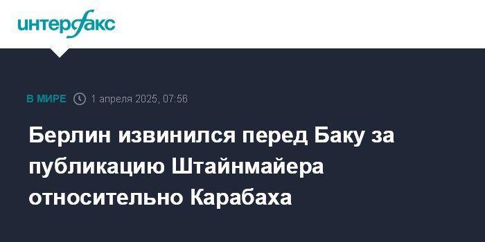 Москва. 1 апреля. INTERFAX.RU - В администрации президента Германии принесли извинения Азербайджану за публикацию, размещенную на странице президента ФРГ Франка-Вальтера Штайнмайера в соцсети.