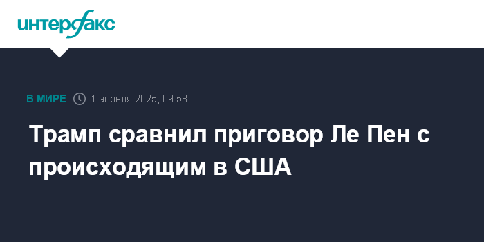 Москва. 1 апреля. INTERFAX.RU - Президент США Дональд Трамп, комментируя вынесенный приговор председателю фракции ультраправого "Национального объединения" в Национальном собрании Франции Марин Ле Пен, отметил схожесть этих обстоятельств с реалиями в политике США.