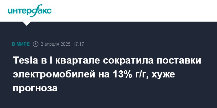 Москва. 2 апреля. INTERFAX.RU - Американская Tesla в первом квартале сократила поставки почти на 13% относительно того же периода прошлого года - до 336,681 тыс. электромобилей.