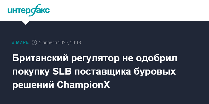 Москва. 2 апреля. INTERFAX.RU - Британское Управление по защите конкуренции и рынкам (CMA) отказалось безоговорочно одобрить сделку, в рамках которой американская нефтесервисная SLB (ранее известная как Schlumberger) планировала приобрести работающую в сфере химических и буровых решений ChampionX Corp.