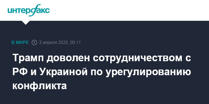 Москва. 3 апреля. INTERFAX.RU - Президент США Дональд Трамп дал положительную оценку тому, как Москва и Киев сотрудничают с его администрацией в вопросе разрешения украинского конфликта.