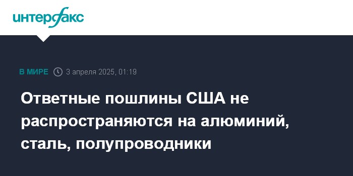 Москва. 3 апреля. INTERFAX.RU - Ответные пошлины, вводимые администрацией США, не распространяются на такие товары, как сталь, алюминий, сообщают американские СМИ.