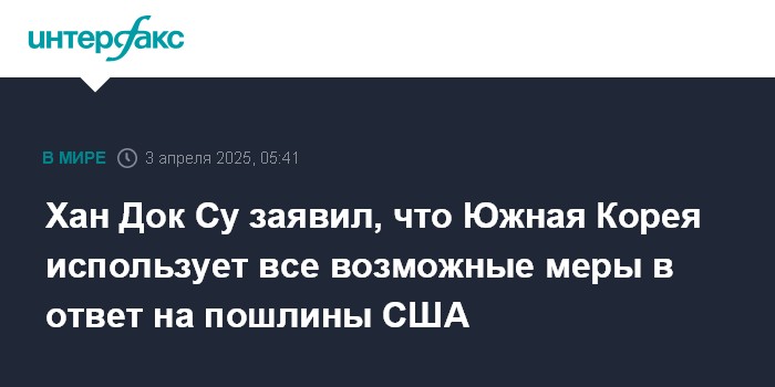 Москва. 3 апреля. INTERFAX.RU - Исполняющий обязанности президента Южной Кореи Хан Док Су поручил правительству в четверг принять все возможные меры в ответ на объявленные США 25-процентные пошлины.