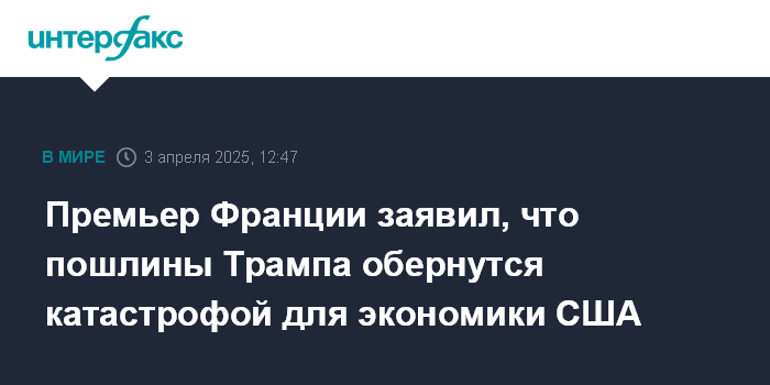 Премьер Франции заявил, что пошлины Трампа обернутся катастрофой для экономики США