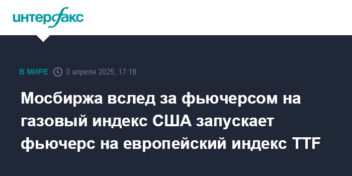 Москва. 3 апреля. INTERFAX.RU - "Московская биржа" 8 апреля запускает новый расчетный фьючерсный контракт на природный газ - на европейский эталонный ценовой индикатор - индекс голландской торговой площадки TTF, говорится в сообщении биржи.