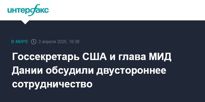Москва. 3 апреля. INTERFAX.RU - Главы внешнеполитических ведомств США и Дании Марко Рубио и Ларс Лёкке Расмуссен провели в встречу в Брюсселе, она состоялась после недавних визитов в Гренландию (самоуправляемая территория Дании) Дональда Трампа-младшего (сына президента США) и вице-президента США Джея Ди Вэнса.
