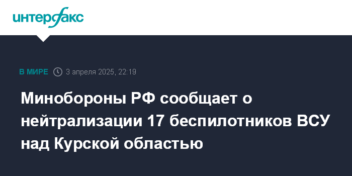 Москва. 3 апреля. INTERFAX.RU - Российские военные сообщили, что вечером в четверг нейтрализовали 17 украинских дронов над Курской областью.