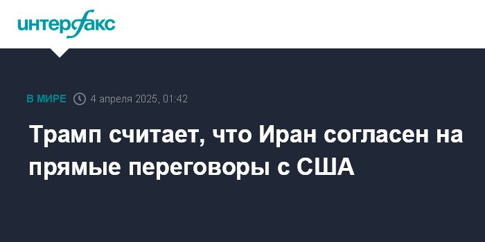 Москва. 4 апреля. INTERFAX.RU - Иранские власти согласны на прямые переговоры с США по ядерной программе, предположил американский президент Дональд Трамп.