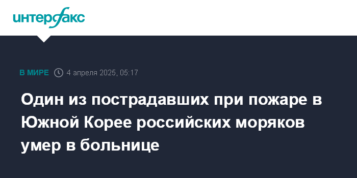 Один из пострадавших при пожаре в Южной Корее российских моряков умер в больнице
