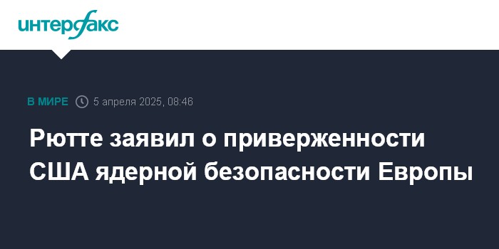 Москва. 5 апреля. INTERFAX.RU - В связи с заявлениями лидеров Германии, Польши и Франции о необходимости расширения ядерного зонтика помимо гарантий защиты, предоставляемых США, генсек НАТО Марк Рютте заявил, что уверен в неизменности американских обязательств.