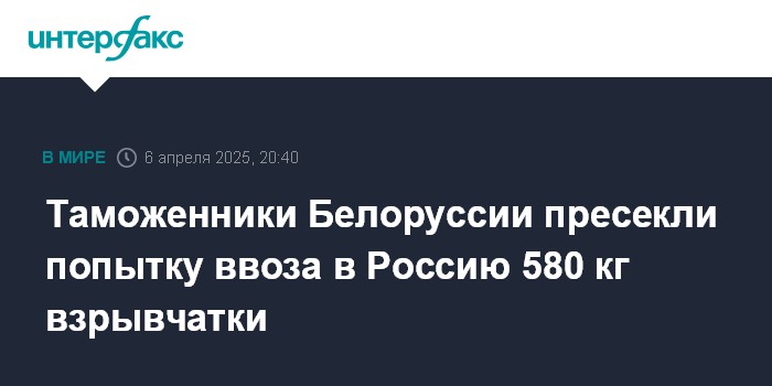 Москва. 6 апреля. INTERFAX.RU - Более полутонны взрывчатки задержали при попытке ввоза на территорию ЕАЭС белорусские таможенники.